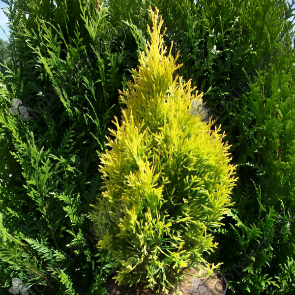 Туя западная Смарагд 'Голд Страйк', Thuja occidentalis Gold Strike - сорт с контрастной хвоей, полукарликовая мутация сорта "Smaragd". Форма узкая колонновидная. Растёт быстро. Взрослое растение высотой 4 м и шириной 1 м. Хвоя тёмно-зелёная. Молодой прирост ярко-жёлтый, красиво контрастирует с более тёмным центром. Требует небольшой обрезки ранней весной. Место солнечное, в тени эти растения редеют, окраска пропадает.