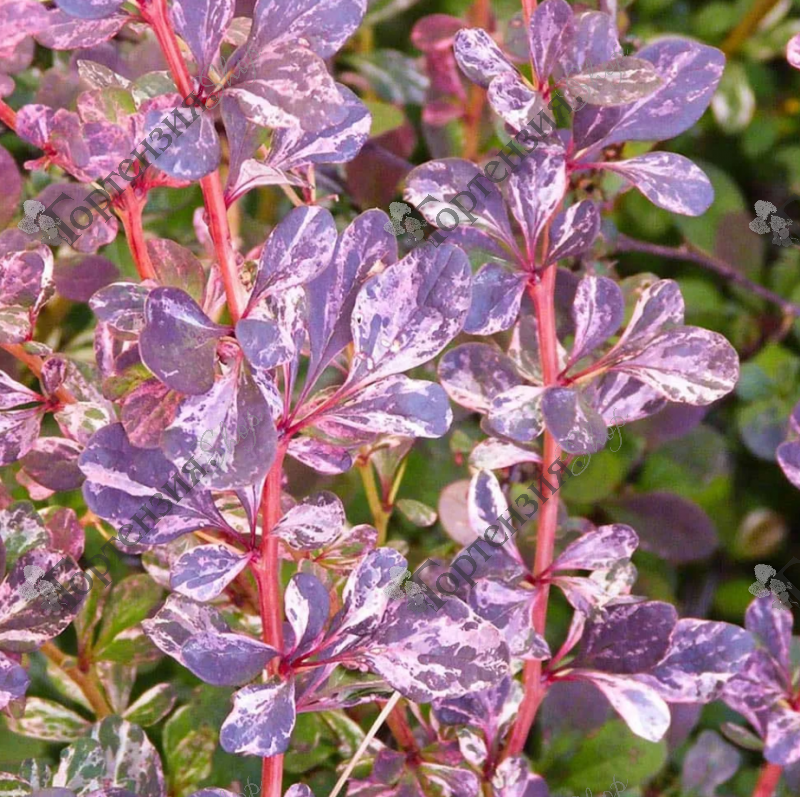 Барбарис Тунберга Фламинго (Berberis thunbergii Flamingo) . Колючий лиственный кустарник с густой округлой кроной. Побеги жесткие, кораллового цвета. Листья темно-пурпурно-серебристо-розовые, с мраморным рисунком розово-серебристого цвета. Цветки  внутри желтые, снаружи красные, собраны в кисти. Цветет в мае. Плоды ярко-красные. Зимостоек. Диаметр кроны взрослого растения: 1,5 м. Высота взрослого растения: 1,5 м.