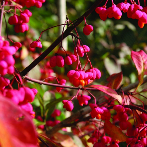 Бересклет европейский Ред Каскад (Euonymus europaeus) - листопадный кустарник высотой 3-4 метра с прямостоячими побегами. Бересклет приобрёл популярность благодаря высокой декоративности листьев, которые имеют достаточно крупные размеры, кожистую структуру и тёмно-зелёный окрас. В осеннее время зелёная масса приобретает удивительно красивые оттенки красного. После опадания всей листвы осенью на кустарнике появляются очень красивые, эффектные плоды — небольшие тёмно-красные коробочки кожистой структуры, которые держатся до наступления заморозков.