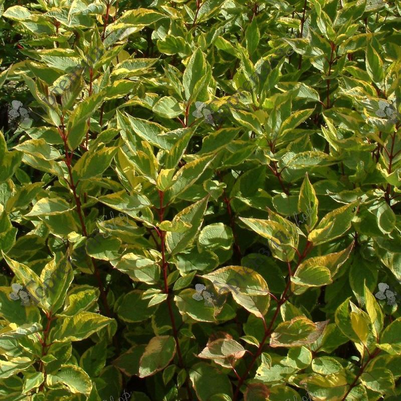 Дерен белый (Cornusalba) Шпэти- неприхотливый, листопадный, раскидистый кустарник семейства Кизиловых высотой и шириной 2,5-3 м. Стебли красные. Листья зеленые с желтым неравномерным окрасом, осенью фиолетовые. Цветки белой, чуть голубоватой окраски, соцветие щиток. Плод костянка, несъедобный.  Используется для одиночной и групповой посадки и как элемент живой изгороди.  Растет на любых плодородных почвах. Морозостиойкость -35 С.