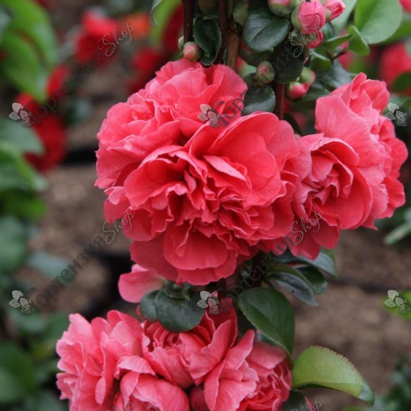Хеномелес прекрасный (Chaenomeles speciosa) Пинк Шторм - плотный округлый кустарник, высотой и шириной до 1м. Побеги прямые, без шипов. Цветки диам.5 см, махровые, ярко-розовые, цветение обильное в мае. Листья глянцевые, тёмно-зелёные. Плоды отсутствуют.Место солнечное или полутенистое. Почва плодородная.