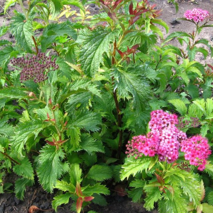 Спирея японская Криспа (Spiraea japonica Crispa) - невысокий кустарник с плотной,раскидистой кроной.Высота куста  дорастает до 70 см, при ширине 80 см. Побеги прямостоячие, иногда изогнутые. Листья зубчатые, волнистые, темно-зелёные, осенью краснеют. Цветки - плоские зонтики,  розово-лилового цвета. Появляются на концах прошлогодних побегов. Цветёт с июля до сентября. Для более продолжительного цветения рекомендуется удаление отцветших соцветий. Спирея лучше всего цветет на открытых, хорошо освещенных местах. В тени  может терять интенсивность окраски листьев и густоту кроны.К  почве нетребовательна. Зимостойка.