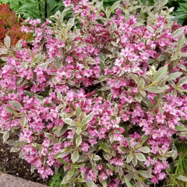 Вейгела цветущая Олл Саммер Монет (Weigela florida All Summer Monet) – низкорослый лиственный кустарник высотой и шириной до 50 см с округлой компактной кроной. Листья пильчатые тёмно-зелёные, с фигурной беловато-розовой каймой, придают растению декоративность даже без цветков. Цветы колокольчатые розовые. Начинает цвести в конце мая или начале июня. В течение месяца кустарник буквально усыпан цветами и выглядит нарядно. В ландшафтном дизайне хорош как в одиночных, так и в групповых посадках. Можно использовать в качестве живой изгороди, бордюра.