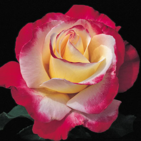 Роза чайно-гибридная 'Double Delight' (Rose Hybrid Tea 'Double Delight') – одна из самых хорошо известных и широко распространенных современных роз в мире. Раскрывающийся бутон идеальной классической формы, медленно распускается. Долго стоит в срезке. Цветки вначале кремово-белые, с красным только на внешних лепестках, но по мере распускания малиновая окраска расширяется, особенно в жаркую погоду. Результат – потрясающий контраст слоев ярко-малиновых внешних лепестков и кремово-белого центра. Цветки очень крупные, появляются обычно по одному, редко по 2-3, на длинных, жестких, колючих побегах. Листва крупная, темно-зеленая, куст прямостоячий, но более ветвистый, и имеет лучшую форму куста, чем большинство чайно-гибридных роз. Сорт очень легок в выращивании, хотя и не исключено появление черной пятнистости или мучнистой росы.  Аромат очень сильный, сладкий, фруктовый. Цветки крупные, с высоким центром, махровые, около 12 см в диаметре.
