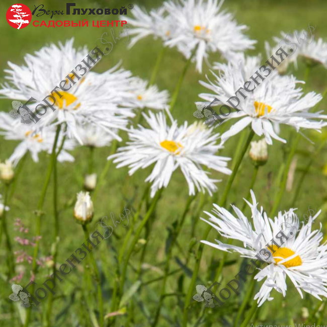 Нивяник великолепный 'Крейзи Дейзи' (Leucanthemum superbum  'Crazy Daisy')Многолетнее цветущее растение высотой до 70 см, шириной до 40 см., листья зеленые, лопастные с зубчатым краем, цветы крупные, полумахровые с тонкими лепестками сравнима разве что с красотой белой хризантемы. Эффектные белоснежные цветы станут ярким фоном для разноцветных соседей. Почвы предпочитает плодородные, без застоя воды место посадки солнечное. Морозостойка.