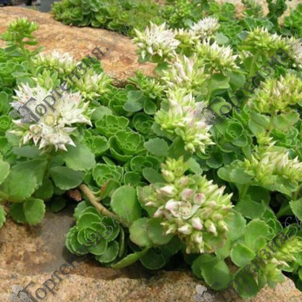 Очиток ложный 'Альбум' - многолетний почвопокровник высотой до 20 см. Стебли стелющиеся, равномерно покрыты зелеными округлыми листьями. В июле на концах стеблей распускаются маленькие белые цветки, образующие небольшие рыхлые соцветия.