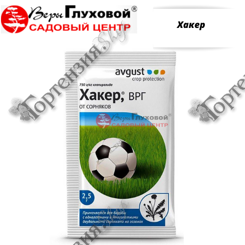 Содержит повышенную концентрацию действующего вещества и с легкостью уничтожает двудольные сорняки, такие как одуванчик, осоты, подорожник, щавель, лютик и другие, при этом не повреждает злаковую газонную траву. Препарат разводится в пропорции 2,5 г (одна упаковка) на 5 л воды, приготовленной жидкостью можно опрыскать 100 кв.м. газона. Обработки проводят после укоса, по участкам с проросшими сорняками. Поглощаясь листьями, Хакер переносится к точкам роста, корням и корневищам, нарушая процесс деления клеток и развитие растения. Через несколько дней листья сорняков скручиваются и желтеют, по истечении 1-3 недель наступает их окончательная гибель.