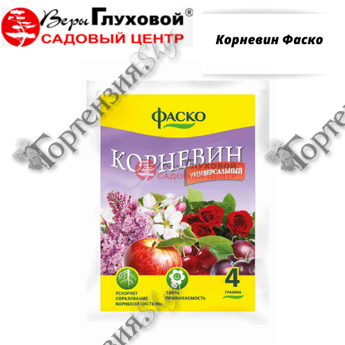 Стимулятор корнеобразования Корневин 4г Фаско Стимулятор роста и развития корней у черенков, рассады, луковиц. Ускоряет корнеобразование, улучшает приживаемость растений при посадке и пересадке всех видов культур.  Применяется для плодовых, ягодных, овощных и цветочных культур. Корневин  используется для укоренения черенков плодово-ягодных (сливы, вишни, черешни и др.), декоративных (роза, сирень, калина, чубушник и др.), цитрусовых культур, виноградной лозы, а также для улучшения приживаемости растений при посадке и пересадке. Преимущества препарата: улучшает приживаемость растений при посадке и пересадке. ускоряет корнеобразование при черенковании обеспечивает приживаемость рассады при пересадке Корневин применяется в сухом виде и в виде раствора В сухом виде.  Опудрить корневую систему саженцев или рассады перед высадкой в грунт. Черенки перед укоренением смочить водой и погрузить их нижнюю часть в препарат. Расход препарата: 4 г на 20-40 черенков. В виде раствора.  Содержимое пакета (4 г) растворить в 4 л